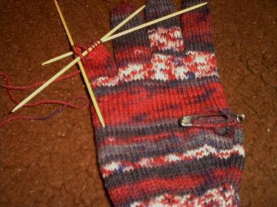 Für den kleinen Finger je 7 Maschen von der Handinnenfläche und des Handrückens wieder auf eine Sicherheitsnadel geben. 2 Runden weiterstricken dabei 2 Maschen für zwischen den Fingern zunehmen. Jetzt von der Innenfläche 7 Maschen und vom Handrücken 8 + der 2 zugenommenen Maschen für den Ringfinger auf eine Sicherheitsnadel geben.