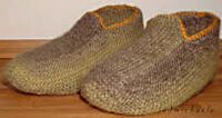 Von den 11 M sind nun noch 7 übrig, die mittlere M markieren, die anderen Markierungen braucht man jetzt nicht mehr. Li und re von dieser M in jeder Hinreihe 3 M zusammenstricken. Dies solange fortführen, bis li und re dieser M noch 20 M übrig sind, also insgesamt 41. Diese M auf 2 Nadeln verteilen und entweder im Maschenstich zusammennähen oder durch Zusammenstricken abketten. Die hintere Naht zusammennähen und wenn man noch Lust hat, die obere Kante mit einem Kontrastgarn im Kettenstich umhäkeln. Ich habe noch ABS-Stopper druntergebügelt, das verhindert, dass sich die Sohlen schnell durchscheuern.