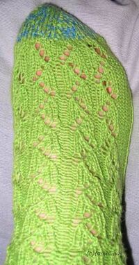 Für Größe: 37-39 (60 M Anschlag) empfiehlt sich folgende Anpassung der Strickschrift: anstelle der beiden linken Maschen innerhalb der Rauten nur 1 linke M arbeiten.