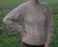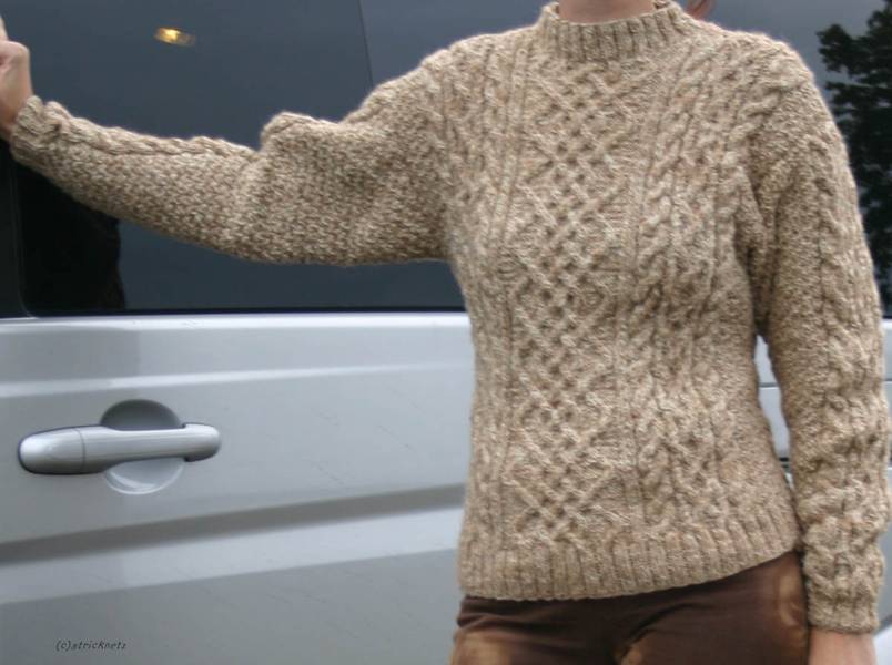 Wie der Pulli zu seinem Namen kam? Das resultiert daraus, dass sich Zopfmuster gegenüber glatt rechtem Gestrick zusammenziehen. Unterschiedliche Zopfmuster ziehen sich unterschiedlich zusammen. Deshalb konnte ich hier nicht exakt auf die gemachte Maschenprobe zurückgreifen sondern musste Schätzungen und Erfahrung zugrunde legen um auf die Maschenzahl zu kommen, die nötig ist. Also im Prinzip erst mal ein Schuß ins Blaue oder auch ein Blindflug mit einer vermutlichen Maschenzahl. Deshalb kann es u. U. sein, dass Maschenzahlen und Schnitt nicht ganz korrekt übereinstimmen. Es sind eben nur gerechnete Werte.