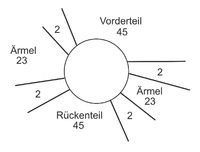 Mit der Rundstricknadel 144 Maschen aufnehmen und 3 cm 3 Maschen rechts, 3 Maschen Links im Bündchenmuster stricken in Runden. Dann 1 Runde glatt rechts. Anschließend die Maschen nach Zeichnung (siehe rechts) einteilen. Die 2 x Maschen bilden die Raglanschrägung. Weiter glatt rechts in jeder 2.Runden vor und nach den 2 Maschen jeweils 1 Maschen herausstricken (bzw. 1 Umschlag). Dies so lange fortführen bis im Vorder- bzw. Rückenteil 155 Maschen erreicht sind ( bei Bedarf auch mehr.). Die Arbeit teilen. Die Maschen der Ärmel auf einen Hilfsfaden ziehen und stillegen. Die Maschen des Vorder- und Rückenteil liegen jetzt auf der Nadel. In Runden weiterstricken, bis die gewünschte Länge des Pullovers erreicht ist.