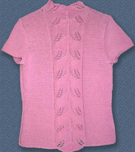 Vorderteil: 82 M anschlagen und einteilen in: 26 M. glatt re., 2M gatt li.,1 x die 26 Maschen des Blattmusters, 2 M.glatt li.,26 M.gatt re die Abnahmen für die Taille, Armausschnitt,Schulterschrägung und Stehkragen genau wie beim Rückenteil arbeiten.