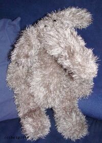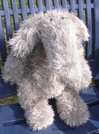 Der hier gezeigte Engelbert ist ohne Schwanz. Als Schwanz kann man z.B. 40 M anschlagen, 6 R glatt rechts str, abketten, mit der rechten Seiten nach außen längs einrollen und festnähen und an den Körper nähen. Viel Spaß