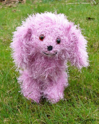 Fäden vernähen, am Kopf von der Nasenspitze aus die Fransen bis zur ersten Reihe mit Linksmaschen die Fransen zurückschneiden.