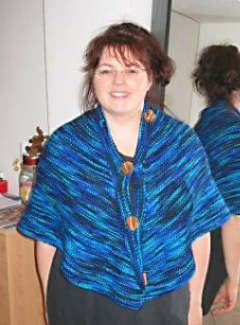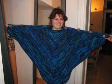 und so sieht der Poncho aus, wenn man nur eine Hälfte nimmt - eigenet sich zum Überlegen an den schon etwas kühleren Sommertagen abends, oder wenn die Heizung mal nicht so richtig will beim Fernsehen usw usf. Vor allem hat man bei dieser Variante die Hände frei - zum Stricken und Spinnen ;-)