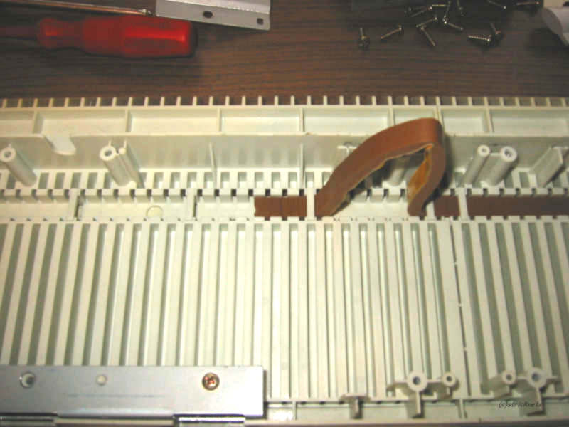 Sind alle Nadeln wieder da, wo sie hingehören, zieht man das Tesa-Moll rechts und links straff, schneidet es auf die richtige Länge und schraubt die Seitenteile der Maschine wieder an.