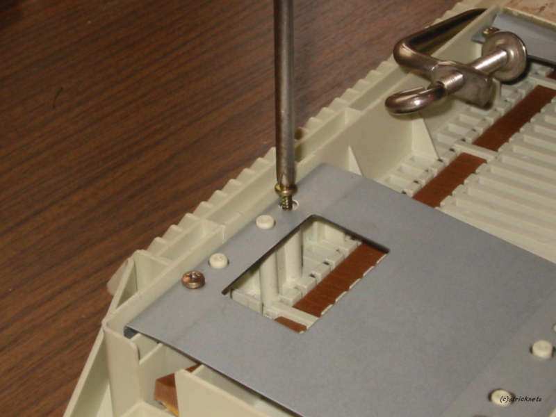 1. Die Computerplatine muss freigelegt werden! Dazu schraubt man den Zubehörkasten und den Computerdeckel ab und entfernt beides (3 kleine Schrauben: links, in der Mitte neben dem Fadenhalter und rechts)