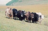 Der oder das Yak (Wer weis das schon so genau) ist ein Wildrind, der in Zentralasien lebt. Im Sommer werfen die Tiere ihr Winterfell in Klumpen ab. Jetzt werden die Grannen von den Flieshaaren getrennt. Übrig bleiben nur ca. 300 - 500 g 10 bis 25 mm lange Vlieshaare (Kann man sich bei dem Riesenvieh kaum vorstellen). Ähnlich wie Kaschmir ist die Wolle sehr weich und dicht, allerdings etwas gröber. Auch ist sie sehr hochwertig. Je nach dem, welche Wolle verwendet wird entstehen daraus Wolldecken, Kleidung, Leinen, Filzstiefel oder Zelte.